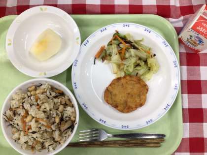 「豆入りひじきごはん、手作り薩摩揚げ、キャベツの塩昆布かけ、りんご、牛乳」
