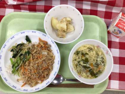 「ビビンバ、じゃが芋の味噌絡め、卵スープ、牛乳」です。