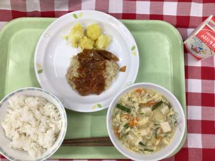 「麦ごはん、豆腐入りハンバーグ、粉ふき芋、にらたまスープ、牛乳」です。