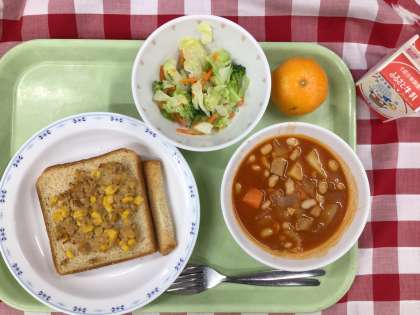 「ツナコーントースト、ポークビーンズ、キャベツとブロッコリーのサラダ、牛乳」です。