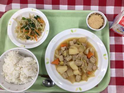 「麦ごはん、鶏肉と大根の旨煮、野菜の胡麻風味、黒砂糖寒天、牛乳」です。