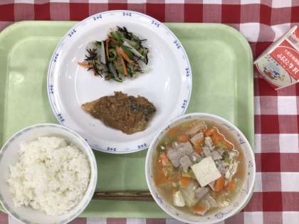 「ごはん、鯖の味噌煮、大根とひじきの和風サラダ、あんかけ汁、牛乳」です。