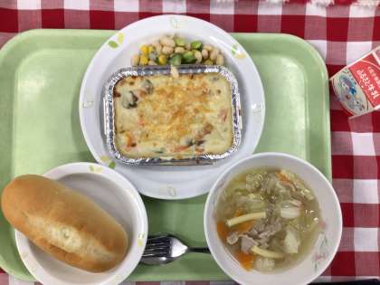 「ソフトフランスパン、ポテトグラタン、ビーンズサラダ、マカロニスープ」です。