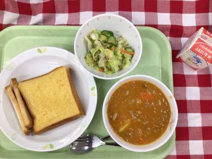 「豆乳フレンチトースト、牛蒡チップサラダ、ハンガリアンシチュー、牛乳」です。