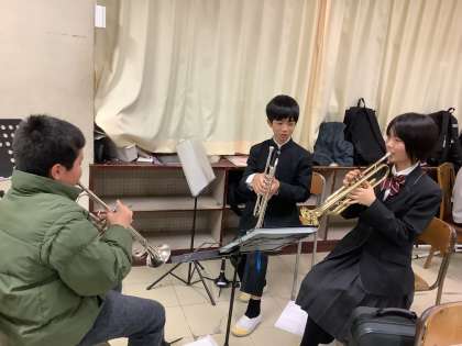吹奏楽 小学生体験がありました。合奏「ジブリソング」でお迎えし、その後それぞれの楽器を少しずつの時間体験していきました。初めて吹くのに大きないい音が出ていたり、「楽しかった」とニコニコ話していたら、部員一同、新入部員がたくさん入って楽しくなりそうな明るい未来を感じました。3月の演奏会もぜひみにきてくださいね。