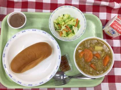 「コッペパンと苺ジャム、カレーシチュー、フレンチサラダ、ココアプリン、牛乳」です。