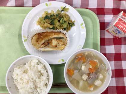 「麦ごはん、白身魚の味噌マヨネーズ焼き、野菜の鰹風味和え、豚汁、牛乳」です。