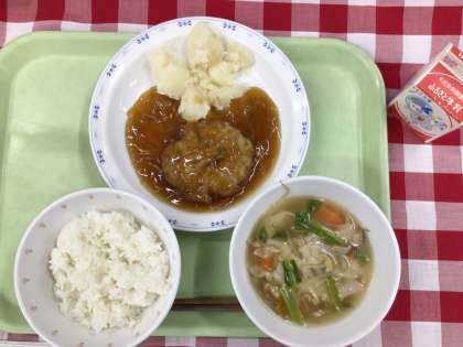 「麦ごはん、中華風ハンバーグ、粉ふき芋、わんたんスープ、牛乳」です。
