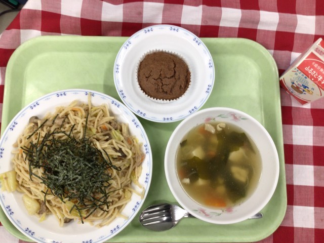 「和風スパゲティ、わかめスープ、おからマフィン、牛乳」です。