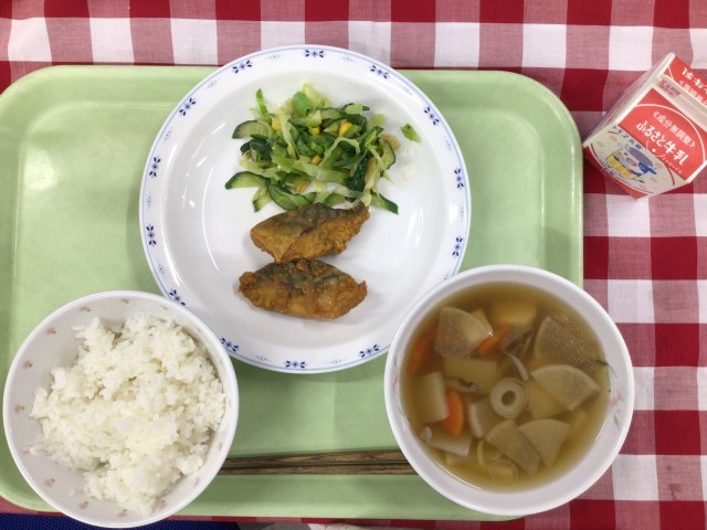 「ごはん、鯖のカレー竜田揚げ、せたがやそだちサラダ、けんちん汁、牛乳」です。