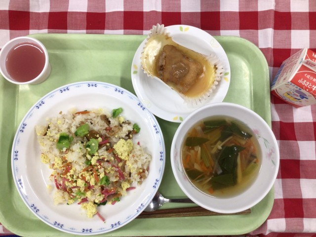 「菜の花寿司、鶏肉の梅肉焼き、沢煮碗、クランベリーゼリー、牛乳」です。