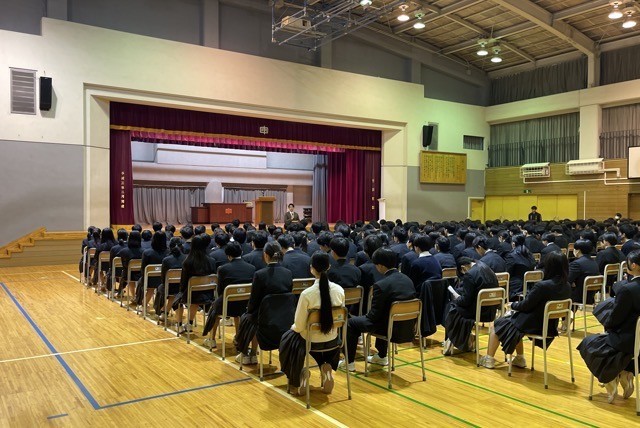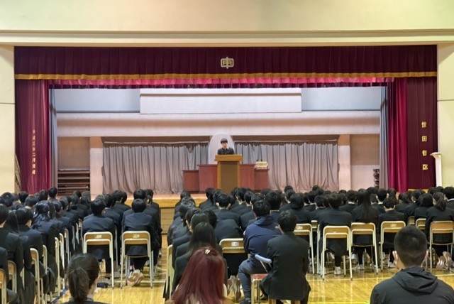 3月11日、三年生による進路報告会を開催しました。三年生の代表生徒四名が、自身の進路選択や勉強方法、授業への取り組み方、志望校の決め方などについて、実体験を交えながら語ってくれました。特に、「どのように受験勉強を進めたか」「どんな壁にぶつかったか」「どのように乗り越えたか」など、具体的なエピソードが多く、1・2年生にとって非常に参考になる内容でした。