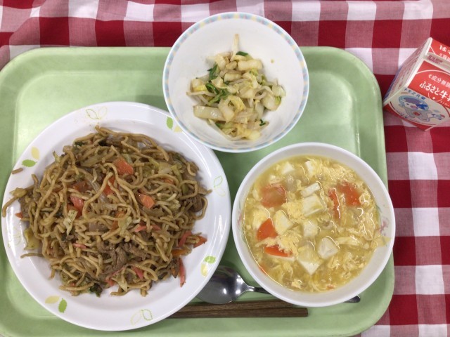 「ソース焼きそば、白菜の中華サラダ、中華風コーンスープ、牛乳」です。