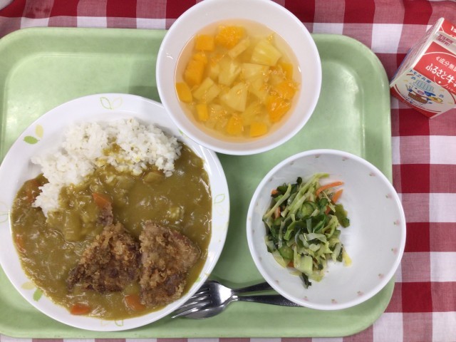 「かつカレーライス、春キャベツとわかめのサラダ、フルーツポンチ、牛乳」です。