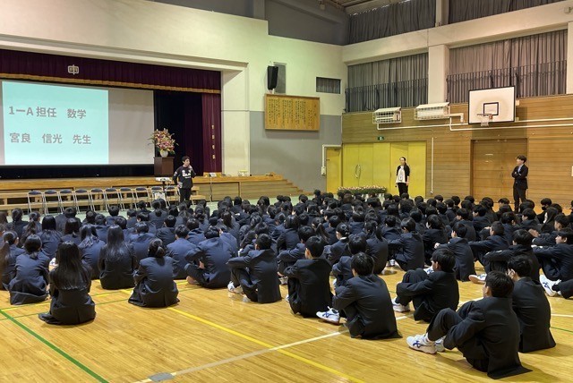 本日2時間目は、1年生の学年集会が行われ、各教科の先生たちが自己紹介をしました。名前や担当教科だけでなく、趣味や中学校時代の思い出など、ユーモアを交えた話に新入生の皆さんも興味津々。しっかりと目を見て話を聞いている表情がとても印象的でした。