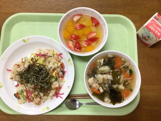 「春のちらし寿司、紅白お吸い物、フルーツ白玉、牛乳」です。
