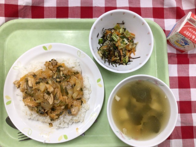 「タッカルビ丼、チョレギサラダ、わかめスープ、牛乳」です。