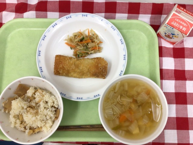 「筍ごはん、白身魚の春巻き、野菜の胡麻酢かけ、豆腐汁、牛乳」です。