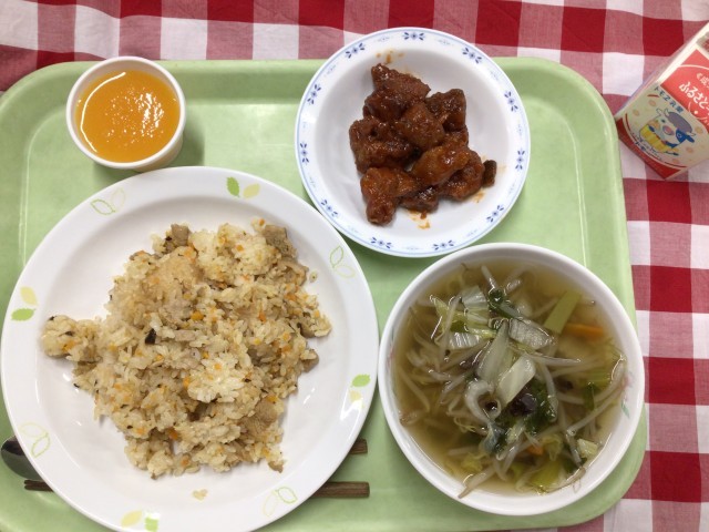 「中華おこわ、鰹の甘酢絡め、中華スープ、キャロットゼリー、牛乳」です。