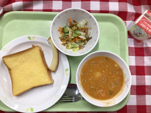 「豆乳フレンチトースト、牛蒡チップサラダ、ハンガリアンシチュー、牛乳」です。
