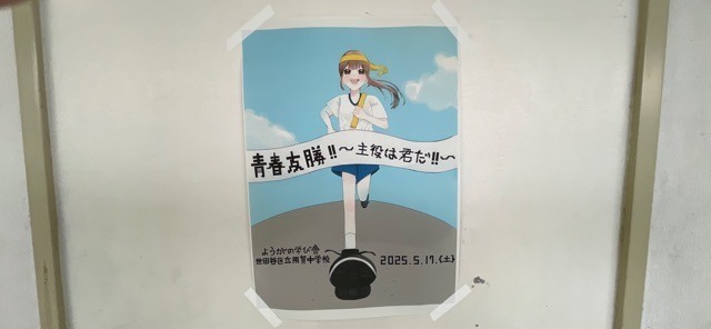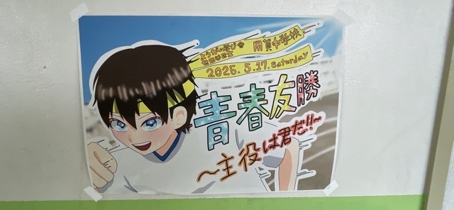 今回のポスターは、延期の空気を吹き飛ばすような明るく前向きなデザインで、生徒たちの「またがんばろう!」という思いをしっかりと後押ししてくれます。背景には空高く掲げられる応援旗や、走る姿のシルエットが描かれ、「青春友勝〜主役は君だ!!〜」というスローガンが力強く映えています。