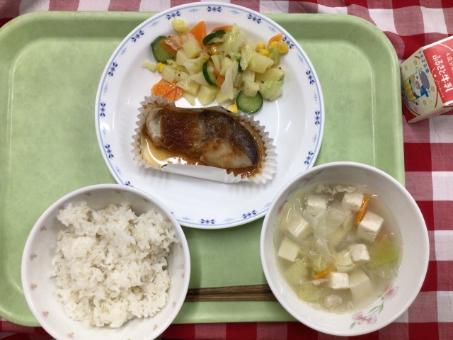 「麦ごはん、白身魚のステーキソース、ポテト入りフレンチサラダ、豆腐スープ、牛乳」です。