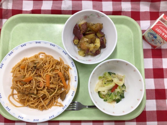 「スパゲティナポリタン、イタリアンサラダ、りんご入り大学芋、牛乳」です。