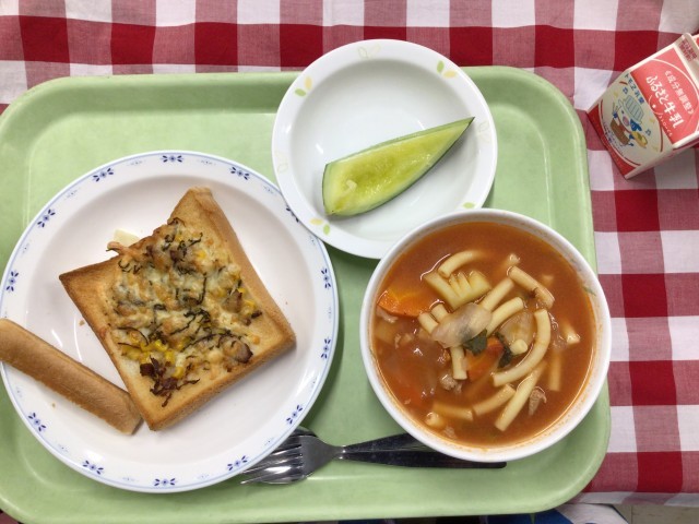 「和風ピザトースト、ミネストラスープ、メロン、牛乳」です。