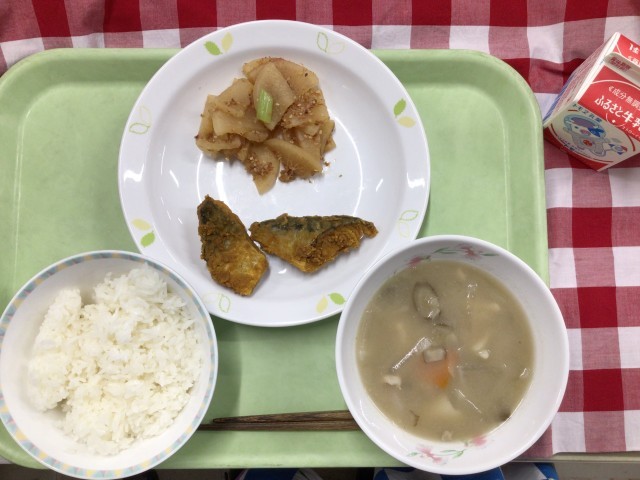 「有機米ごはん、鯖のカレー竜田揚げ、大根の土佐漬け、ひっつみ汁、牛乳」です。