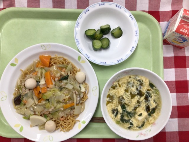 「五目あんかけそば、胡瓜の甘酢かけ、かき卵汁、牛乳」です。