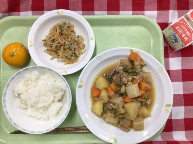 「ごはん、筑前煮、切干大根の胡麻酢和え、冷凍みかん、牛乳」です。