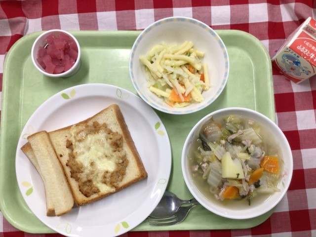 「豆入りそぼろチーズトースト、マカロニサラダ、ベーコンと白菜のスープ、紫陽花ゼリー、牛乳」です。
