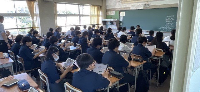 用賀中学校では、毎朝8時25分から10分間、「朝キュビナ」の時間を設け、全校でタブレットを活用した朝の学習に取り組んでいます。