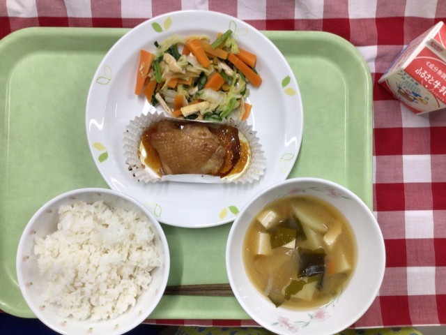 「麦ごはん、鶏肉の照り焼き、小松菜と揚げのおひたし、じゃが芋の味噌汁、牛乳」です。