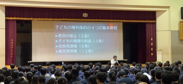 平尾先生からは、「子どもにも権利があること」「安心して思いを伝えられること」「違いがあっても大切にされること」「困ったときには助けてもらえること」といった“当たり前”の権利が尊重される社会について、わかりやすくお話しいただきました。生徒たちはうなずきながら耳を傾け、子ども自身が社会の一員として尊重される大切さを学びました。