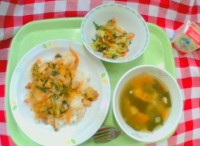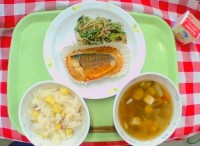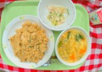 献立は 「和風ピラフ、大根サラダ、豆腐スープ、牛乳」です...
