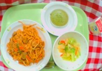献立は 「スパゲティミートソース、イタリアンサラダ、フル...