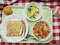 献立は 「きのこ入りハッシュドポークライス、りんごと白菜...