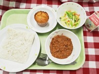 献立は「ソフト麺、ミートソース、コールスローサラダ、キャロットマフィン、牛乳」で...