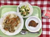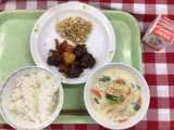 献立は 「あんかけ炒飯、北京ダック風チキン、豆腐サラダ、牛乳」です。 温かさを...