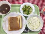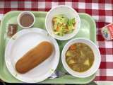 献立は 「コッペパンと苺ジャム、カレーシチュー、フレンチサラダ、ココアプリン、牛...