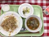 献立は 「豚丼、蕪の甘酢漬け、けんちん汁、ホワイトゼリー、牛乳」です。 今日か...
