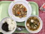 献立は 「麦ごはん、海苔とひじきの佃煮、じゃが芋のそぼろ煮、豆腐チゲ、牛乳」です...