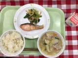 献立は 「雑穀ごはん、鮭の塩焼き、野菜の胡麻和え、すいとん、牛乳」です。 ...
