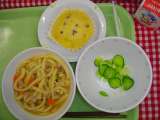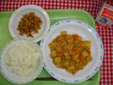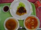 献立は 「ミーゴレン、野菜の甘酢かけ、フルーツ白玉、牛乳」です。 「ミーゴレ...