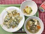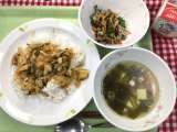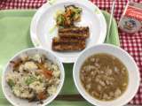 献立は 「青菜と海老の炒飯、辣白菜(ラーパーツァイ)、中華風豆腐スープ、牛乳」で...