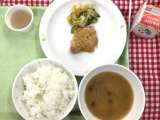 献立は 「糧飯、富岡ホルモン揚げ、野菜の塩昆布和え、富岡こしね汁、牛乳」です。 ...