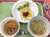 献立は 「ぶどうパン、スペイン風オムレツ、フレンチサラダ、ABCスープ、牛乳」で...