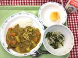 献立は 「秋野菜のカレーライス、和風サラダ、柿、牛乳」です。 土曜日は、合...