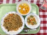 献立は 「ミーゴレン、野菜の甘酢かけ、フルーツ白玉、牛乳」です。 今日の...